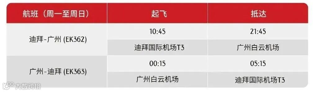 自2月1日起,阿联酋航空将进一步增加迪拜往返广州的客运服务至每日一班,EK362/EK363将全部改为直航,且继续采用阿联酋航空A380旗舰机型执飞。自2月起,阿联酋航空迪拜往返广州的每日航班时刻安排如下: