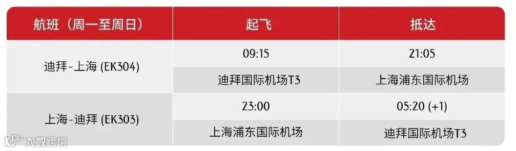 自3月1日起,迪拜-上海航线将增至每日一班,并改为直飞服务,由三舱版波音777-300ER客机执飞。3月起,迪拜直飞上海航线航班时刻将调整如下: