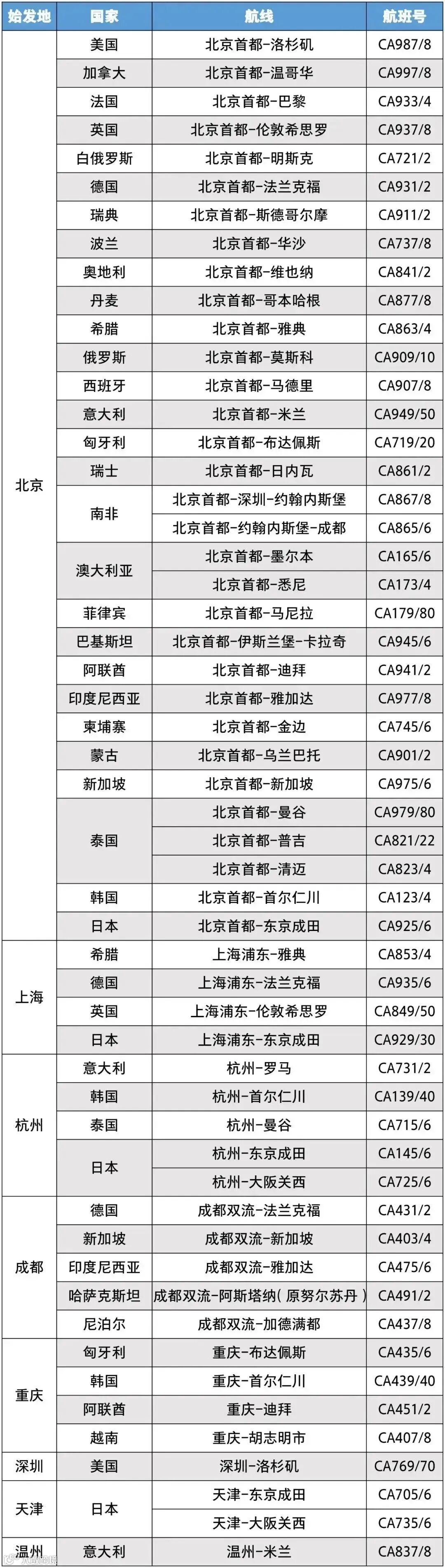 近期,国航将恢复北京-曼谷、北京-普吉、北京-清迈、北京-日内瓦、北京-墨尔本、北京-悉尼、成都-中国台北、武汉-中国澳门航线运营,具体信息如下: