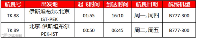 从2023年2月16日(含)起,土耳其航空将恢复伊斯坦布尔到北京的往返航班运营。伊斯坦布尔到北京的往返航班为每周2班,具体航班时刻信息如下:
