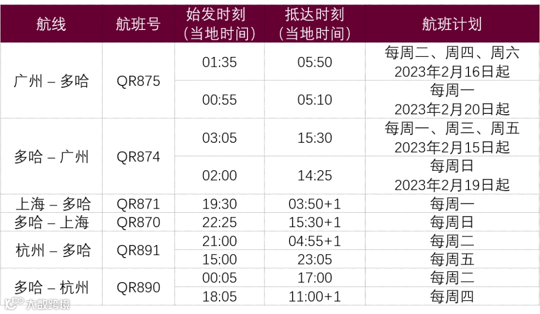 卡塔尔航空近日宣布将于2023年2月15日起,增加广州往返多哈的航班至每周4班。更新后卡塔尔航空往返中国大陆航班计划如下: