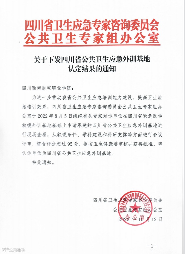 2022年,西南航院获评四川省公共卫生应急外训基地,这是继获评四川省紧急医学救援外训基地后又一紧急救援训练基地。