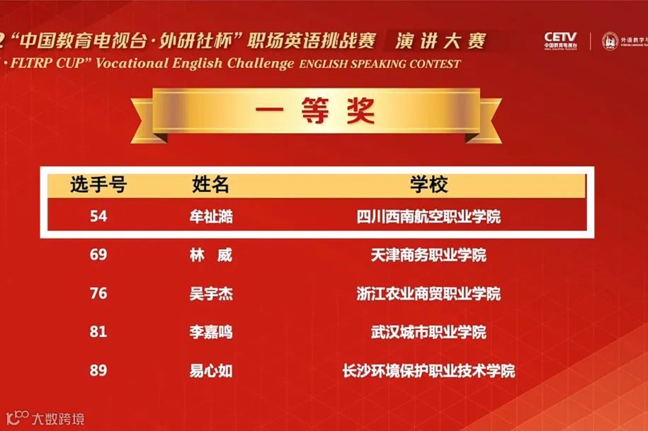 2022年,西南航院师生在国家级教学类竞赛中斩获多个奖项,“教学之星”全国复赛一等奖、职场英语挑战赛全国指导一等奖、全国大学生英语词汇能力大赛特等奖等。值得一提的是,在“中国教育电视台·外研社杯”职场英语挑战赛演讲大赛中,国际学院学生牟祉澔以四川省一等奖的成绩进入全国总决赛,并获得全国英语演讲总决赛一等奖的佳绩。