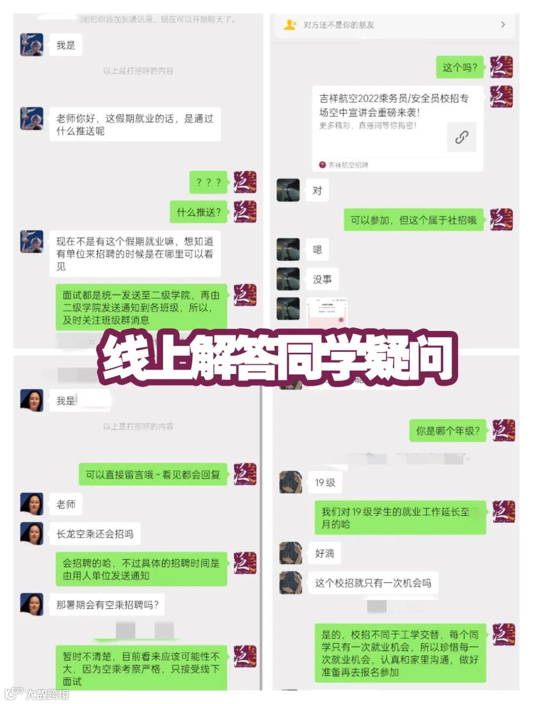 “云指导”创新就业指导方式,利用会议软件、直播等的方式进行就业指导,帮助同学们充分了解所面试的行业和岗位。“云咨询”作为就业开放日的延续,疫情期间学院就业处利用网络平台开放咨询,10余位专业职业咨询师,全天候回复咨询信息,期间回复留言超1000条,线上服务900余人。