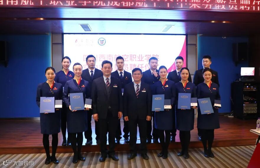 推动职业教育高质量发展,注入产教融合新力量,10月14日,在党的二十大全国盛事来临之际,四川西南航空职业学院空中乘务教员聘任仪式举行,15名成都航空乘务教员正式受聘为学院空乘专业客座教授、教员。成都航空副总经理周勇,服务管理中心总经理陈静,服务管理中心副总经理马晶,泛美教育集团副总裁、乘务培训中心主任,西南航院院长尹析明,党委书记岳文喜,副院长尤康,副院长兼空中乘务学院院长张雪梅,空保学院院长刘元超以及成都航空乘务教员、西南航院空乘专家、空乘专业教师们参与了聘任仪式。