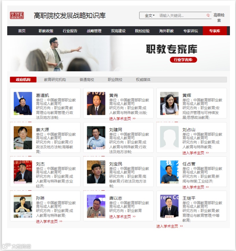 职教专家库选取来自政府部门、研究机构、普通高校、高职院校、权威媒体不同类型机构的知名专家入驻,目前共有170多名职教专家,每位专家的论著均可阅读下载。
