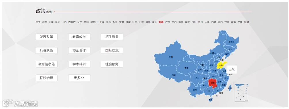 采集国务院、发改委、教育部、财政部、各省市教育厅、教育委员会等政府官网发布的政策文件、政策解读、通知公告、新闻动态等,共有政策类相关数据230000余条,时间可追溯到1980年。