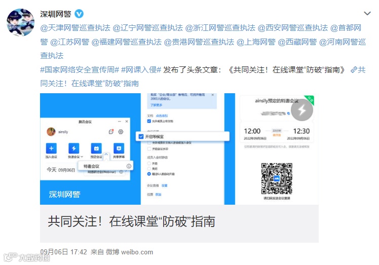 9月6日,腾讯会议官方账号发文《共同关注!在线课堂‘防破’指南》,会前、会中、会后可采取多个举措,来保障在线课堂的安全。