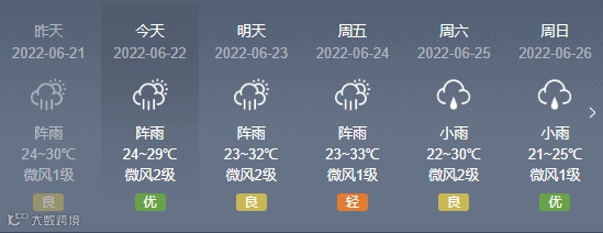 成都市气象台2022年06月22日13时08分发布暴雨黄色预警信号:预计我市锦江区、青羊区、金牛区、武侯区、成华区、青白江区、高新西区、高新南区和成都东部新区等个别乡镇(街道)未来6小时降雨量将达50毫米以上,降雨时伴有雷电和6级以上阵性大风。