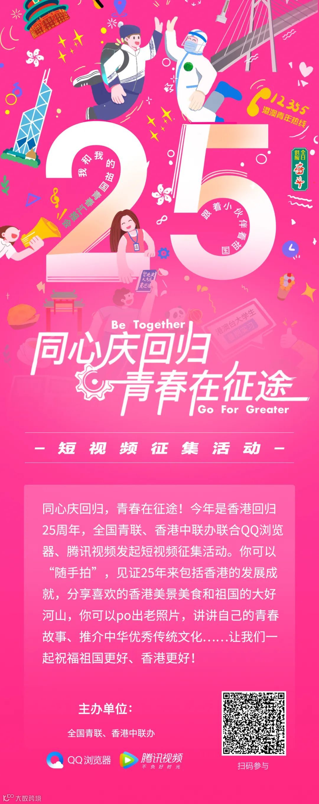 全国青联、香港中联办联合腾讯视频、QQ浏览器共同开展“同心庆回归 青春在征途”短视频征集活动。你可以“随手拍”,见证25年来包括香港的发展成就,分享喜欢的香港美景美食和祖国的大好河山,你可以po出老照片,讲讲自己的青春故事、推介中华优秀传统文化……让我们一起祝福祖国更好、香港更好!