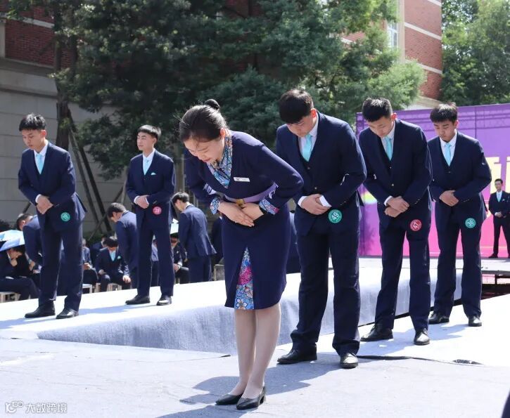 面露浅笑、队列齐步、弯腰鞠躬,蹲起坐立……女生优雅温婉、男生绅士有范,每一个细致又熟练的动作,每一处透露着专业的细节,都是同学们日常坚持训练所得,是努力所获的繁花硕果。