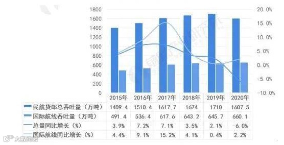 ⬆2015~2020年中国民航机场货邮吞吐量及国际航统吞吐量交化情祝