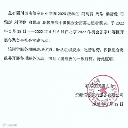 除了本次冬奥志愿服务,周浩也有过南省抗洪抢险任务、建国七十周年阅兵安检等丰富经历,每一段经历令他受益匪浅,“我明白了团队协作的意义,深切体会到服务行业所需的品质即理解礼貌、服务热心、细节周到,这无疑为我的后续面试航空岗位增添了不小优势。”