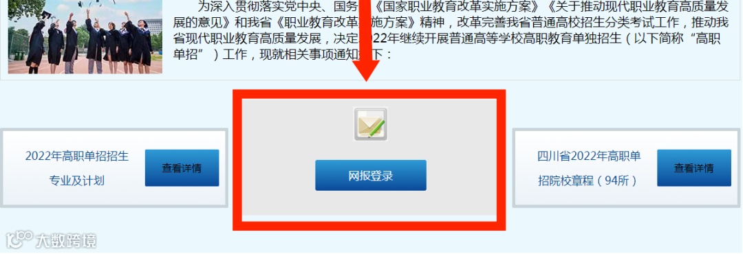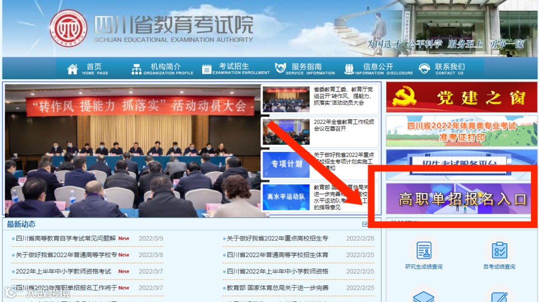 登录四川省教育考试院网站http://www.sceea.cn即“2022年单独招生网上报名系统”,点击图片所标注窗口,即可进入单招报名登录页面。