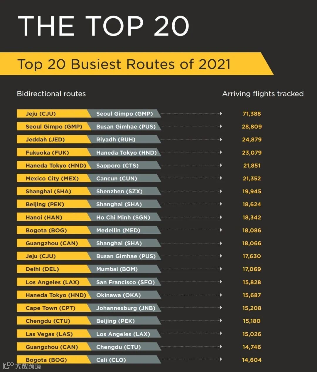 TOP20的航线中,有13条来自亚洲,尤其是中国的国内航线。我国上榜的航线有:上海虹桥-深圳宝安、北京首都-上海虹桥、广州白云-上海虹桥、成都双流-北京首都、广州白云-成都双流。