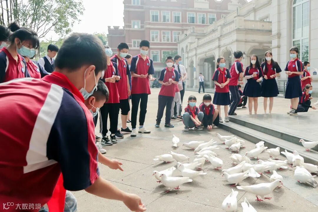 观校园建筑,体文化底蕴。在“导游”的带领下,孩子们列队走过凯旋门、太阳广场、钟楼、圣玛利亚大桥等,一路欢声,雀跃不已。尤其是在维多利亚广场与鸽群不期而遇,更是惊喜万分,孩子们蹲下身来亲近白鸽,体会投喂之趣。