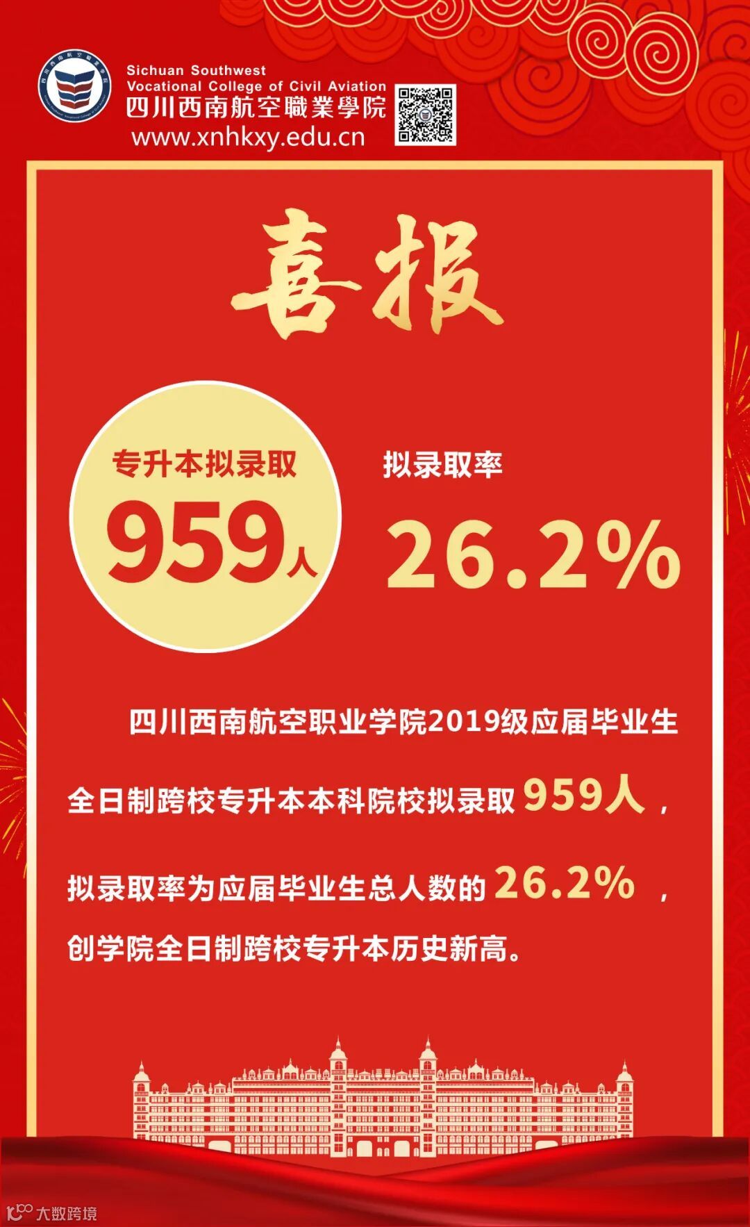 心田耕耘有矢志,硕果飘香又一年。四川西南航空职业学院2019级应届毕业生全日制跨校专升本本科院校拟录取959人,拟录取率为应届毕业生总人数26.2%,创学院全日制专升本历史新高。