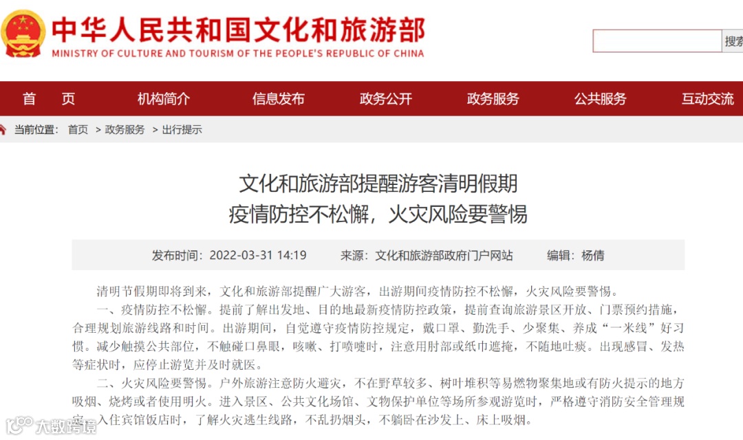 清明节假期即将到来,文化和旅游部提醒广大游客,出游期间疫情防控不松懈,火灾风险要警惕。