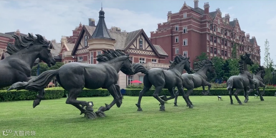 九匹骏马雕像屹立在绿草茵茵的广场中