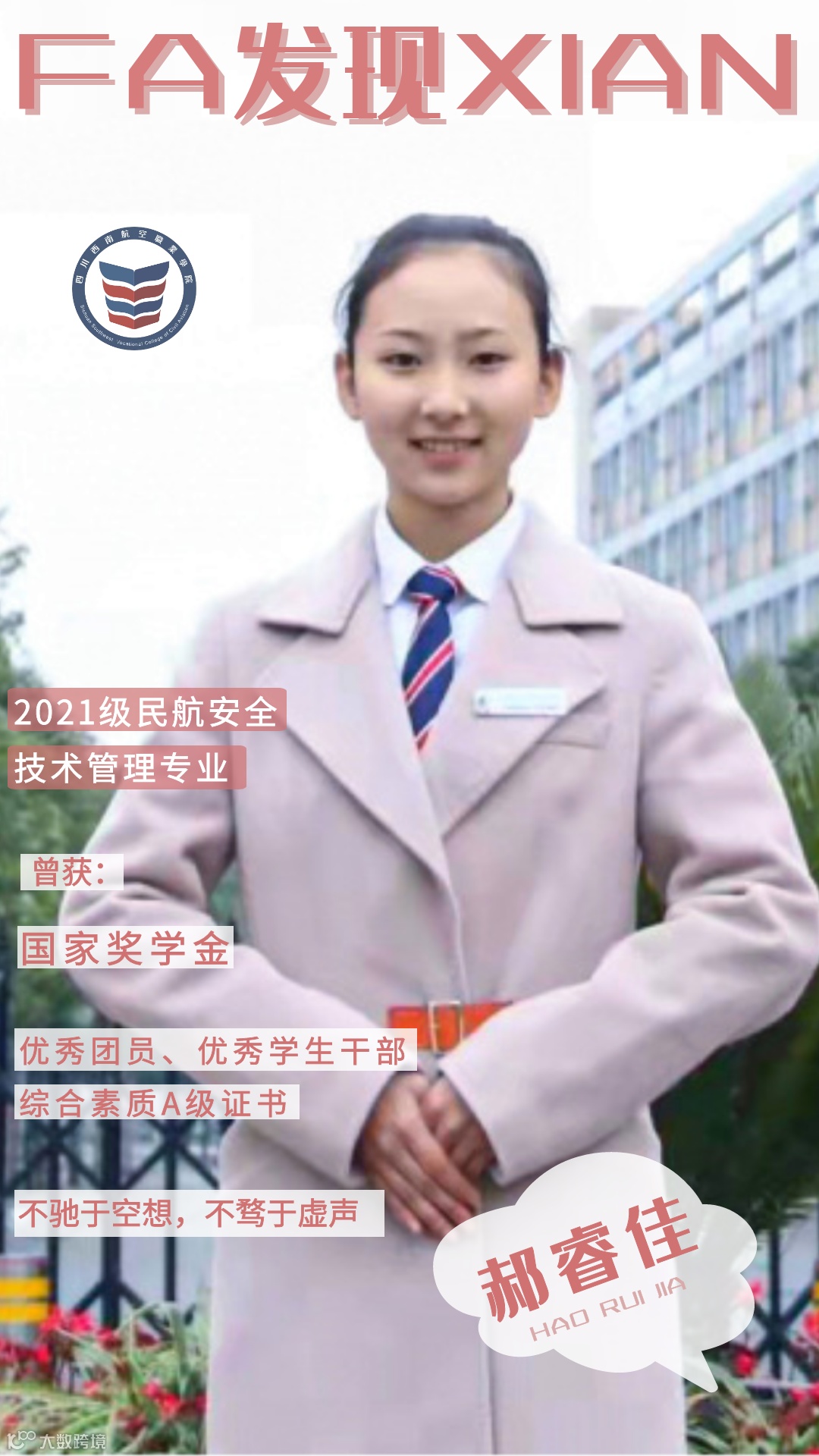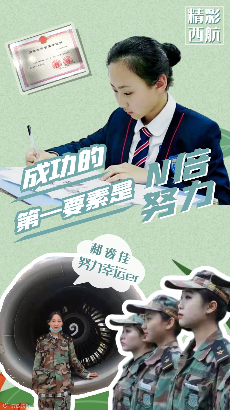 不驰于空想,不骛于虚声。从成航校到西航,改变的是环境与身份,不变的是郝睿佳内心的那份谦虚和自律。在成航,郝睿佳便凭借踏实的品质获得过国家奖学金、“军训标兵”、“礼仪标兵”、“学习标兵” 等荣誉,现来到西航,她亦有将这份拼搏延续的信心,她说:“兴趣是最好的老师,学习没有捷径,充分认识自己的优缺、兴趣,再自律、坚持,才会有所收获。”
