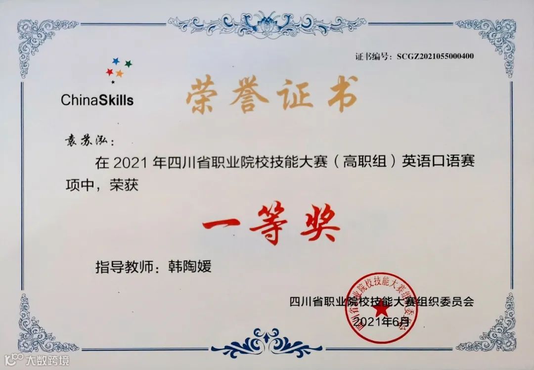 来自空港管理学院民航运输专业,荣获2021年“外教社·词达人杯”全国大学生英语词汇能力大赛全国决赛“特等奖”、2021“外研社·国才杯”全国英语写作大赛“一等奖“三项国家级奖项,收获四川省2021年高职院校“高教社杯”大学生英语口语技能大赛“一等奖”、2021“外教社·词达人杯”全国大学生英语词汇能力大赛四川赛区高职组“特等奖”、2021“外研社·国才杯”四川省高等职业院校学生英语挑战赛写作比赛“特等奖”这三项省级英语奖项。