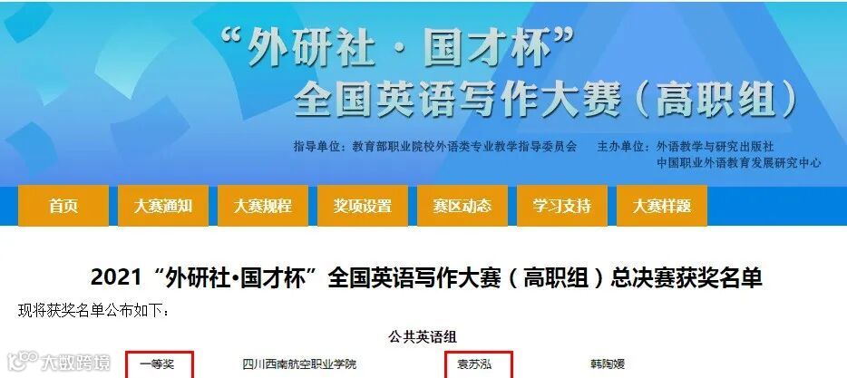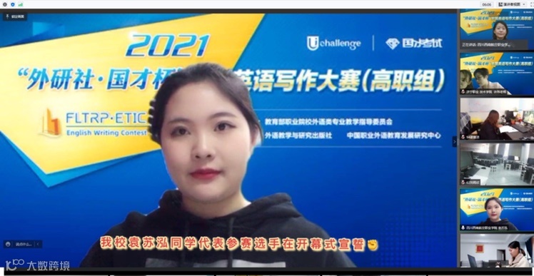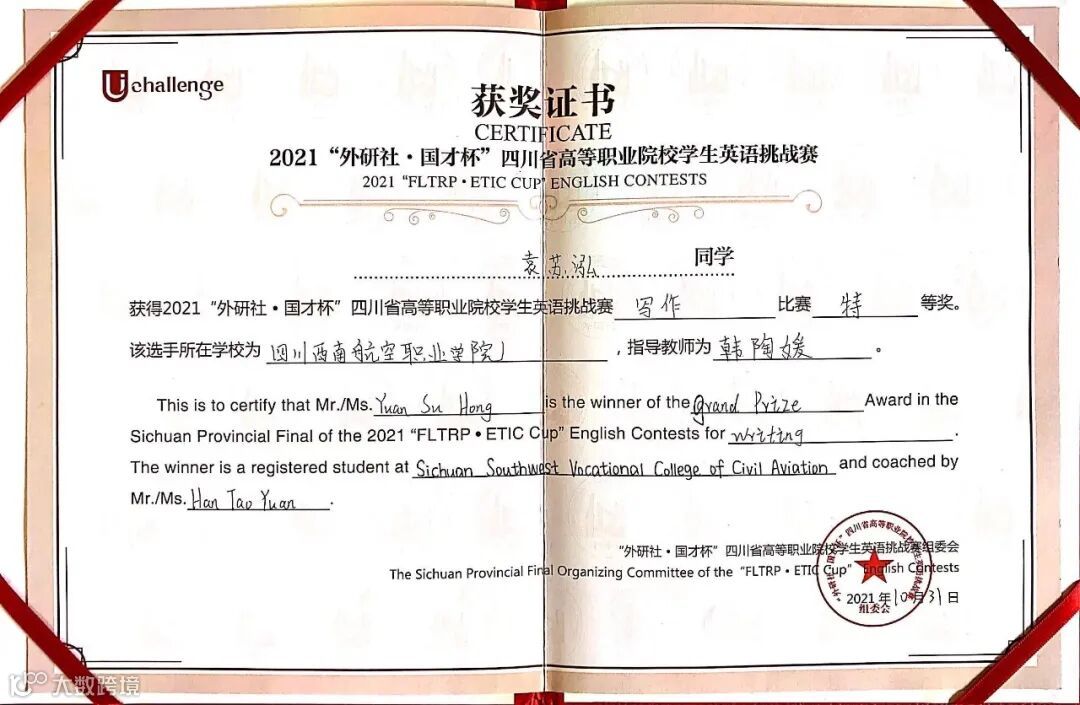 2021年12月,“外研社·国才杯”全国英语写作大赛(高职组)总决赛远程线上成功举办,我校空港管理学院袁苏泓同学获得一等奖。