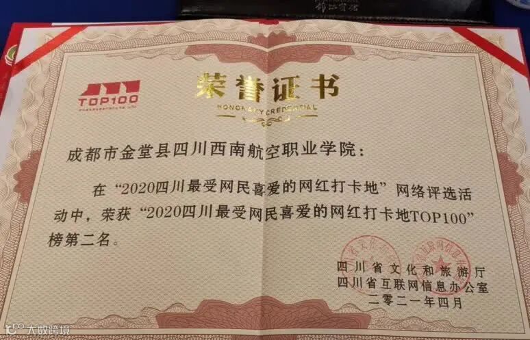 四川西南航空职业学院在“2020四川最受网民喜爱的网红打卡地TOP100”中位列第二位,网红打卡地实至名归;此外,学院被评为四川省首批“节水型高校”,“2021年度网络学习空间应用优秀学校”,获批机械行业能力评价考试站。