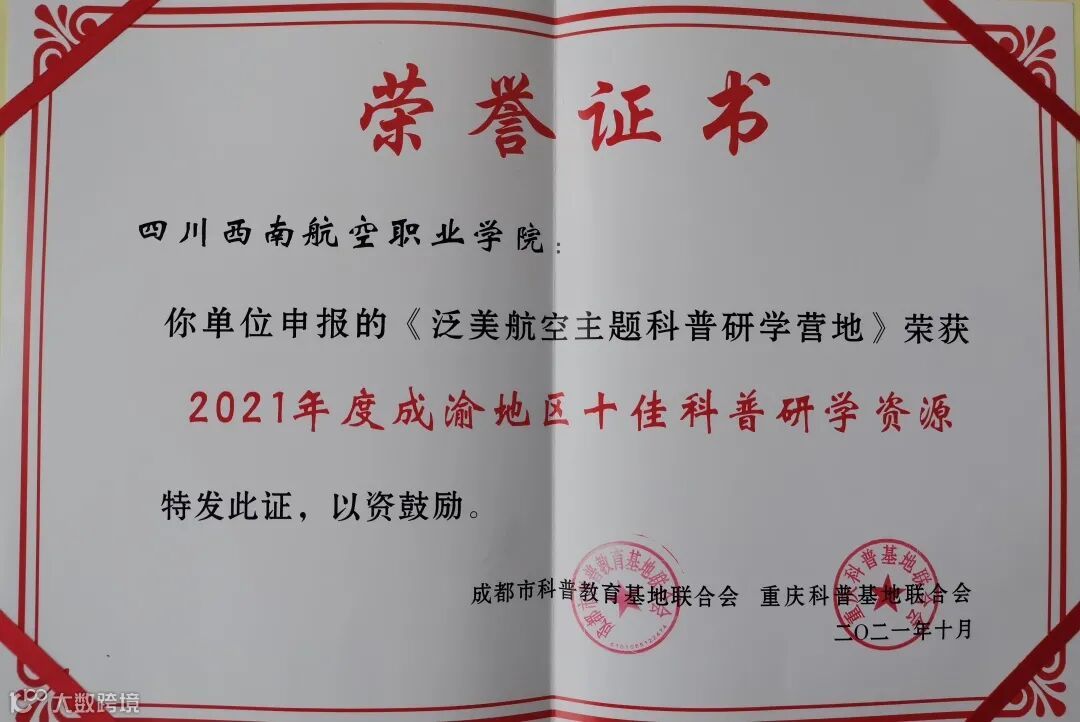 推动成渝地区科普资源共享,深化成渝地区科技创新合作,“泛美航空主题科普研学营地”被评为“2021年度成渝十佳研学资源”。