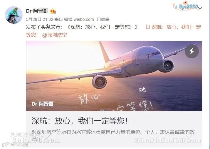 5月28日,无锡市人民医院胸外科博士赵晋通过个人微博发布了一篇名为《深航:放心,我们一定等您!》的长文,表达最诚挚的敬意。