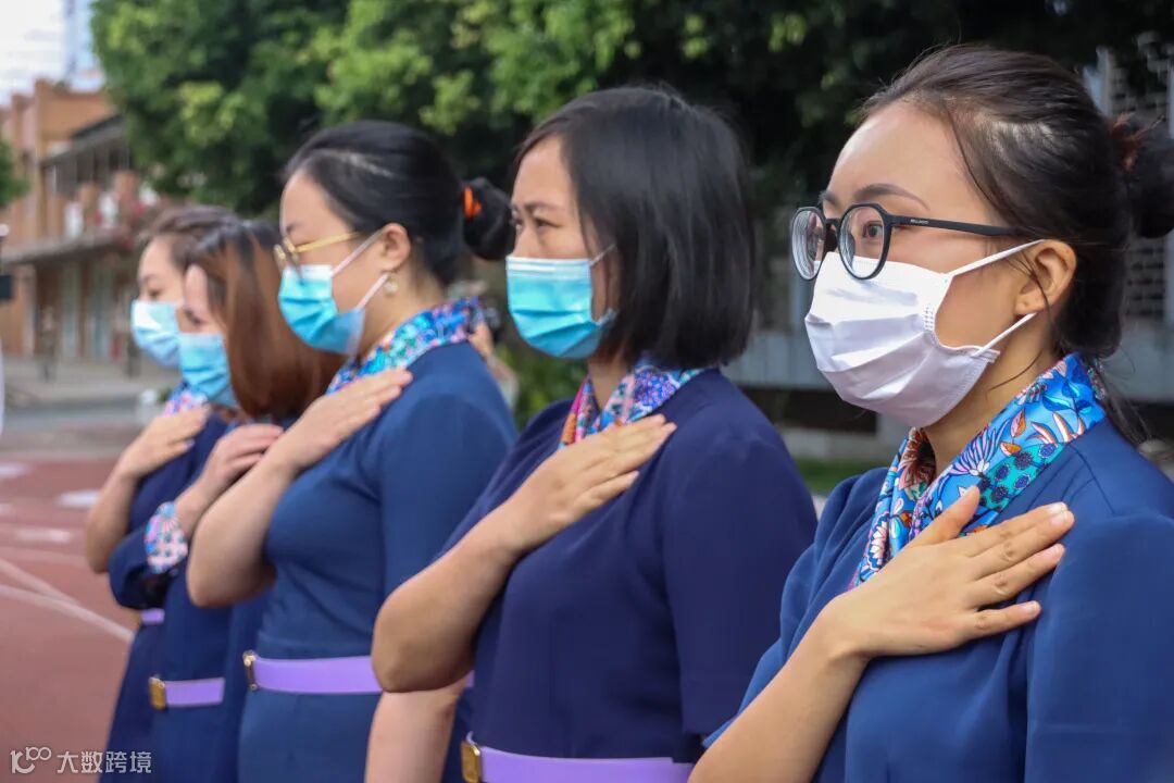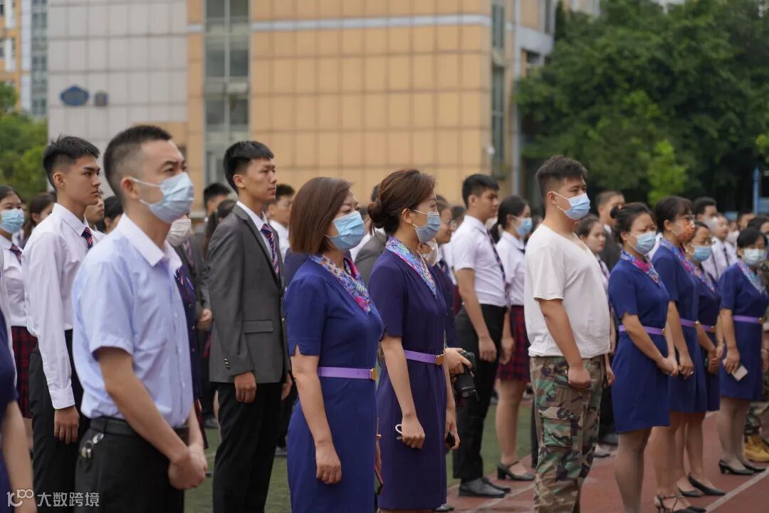 风和日丽,阳光明媚,朵朵白云在蔚蓝的天上轻轻地飘着。同学们们着标准职业装和作训服,排着整齐的队列,心潮澎湃地望向旗台的方向,目光坚定。伴随着雄壮有力的国歌响起,鲜艳的五星红旗在在国旗护卫队的护卫下徐徐飘扬。
