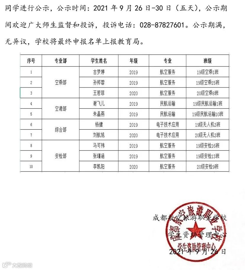 成航校 | 速看!我校2020-2021学年中等职业教育国家奖学金十名学生公示名单