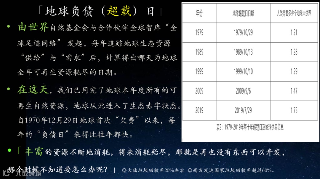 世界自然基金会(WWF)在《2006年度生命地球报告》中称,在1961年至2003年间,人类对自然资源的消耗量翻了三倍,假设人类按照目前速度消耗资源,到2050年将消耗掉相当于两个地球才能提供全部自然资源。