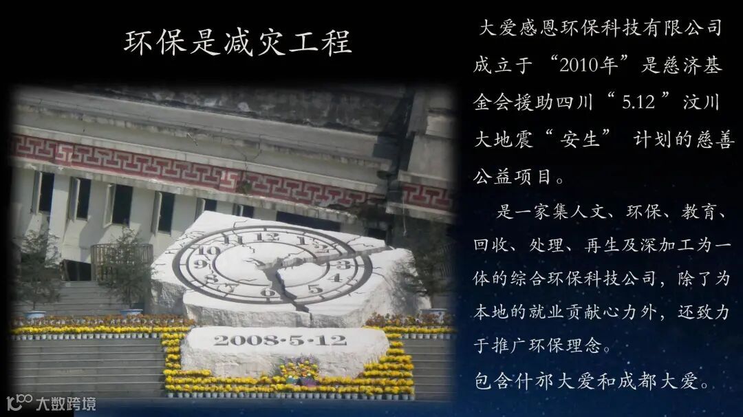大爱感恩环保科技有限公司成立于 “2010年”是慈济基金会援助四川“ 5.12 ”汶川大地震“ 安生” 计划的慈善公益项目。