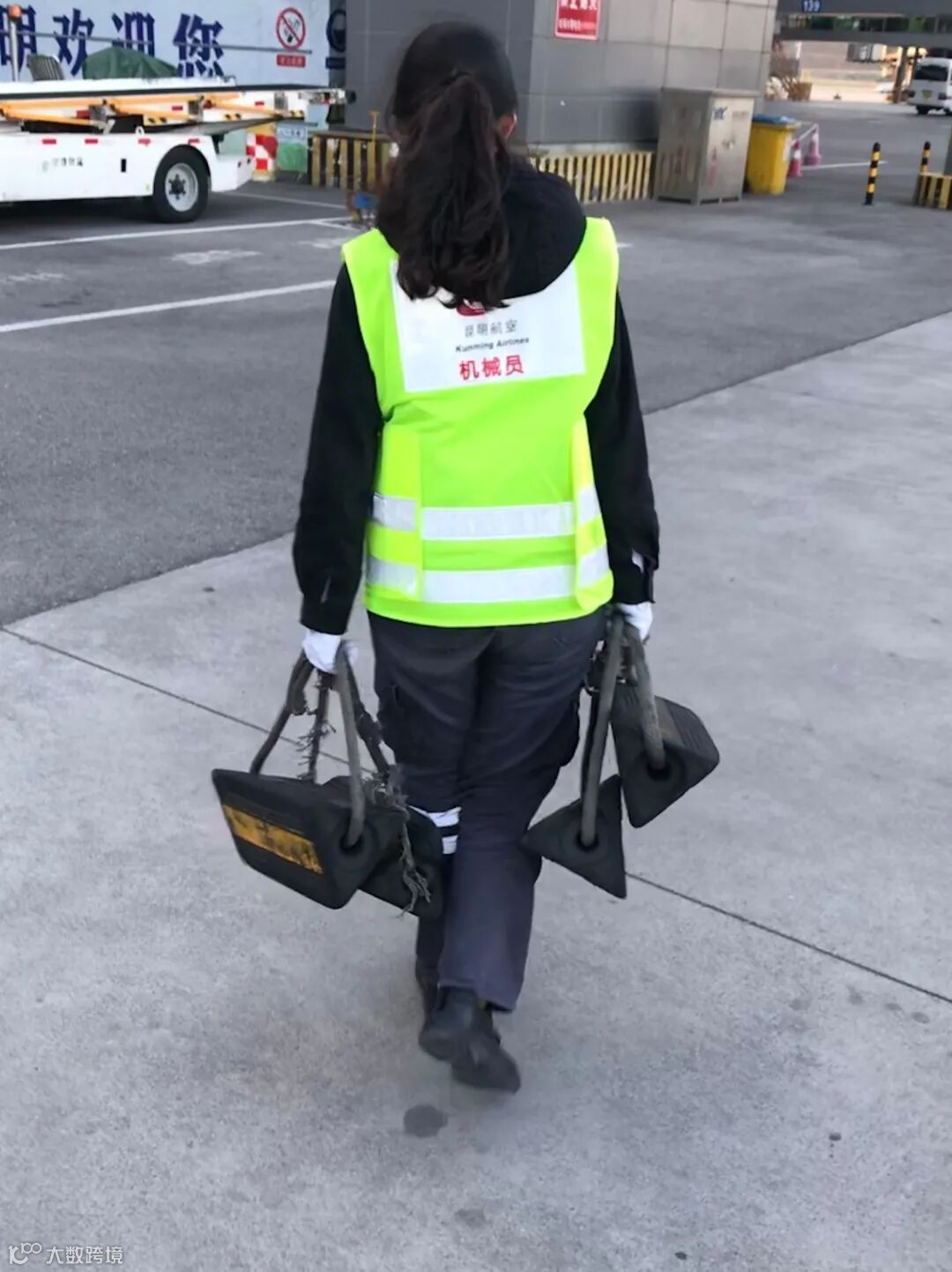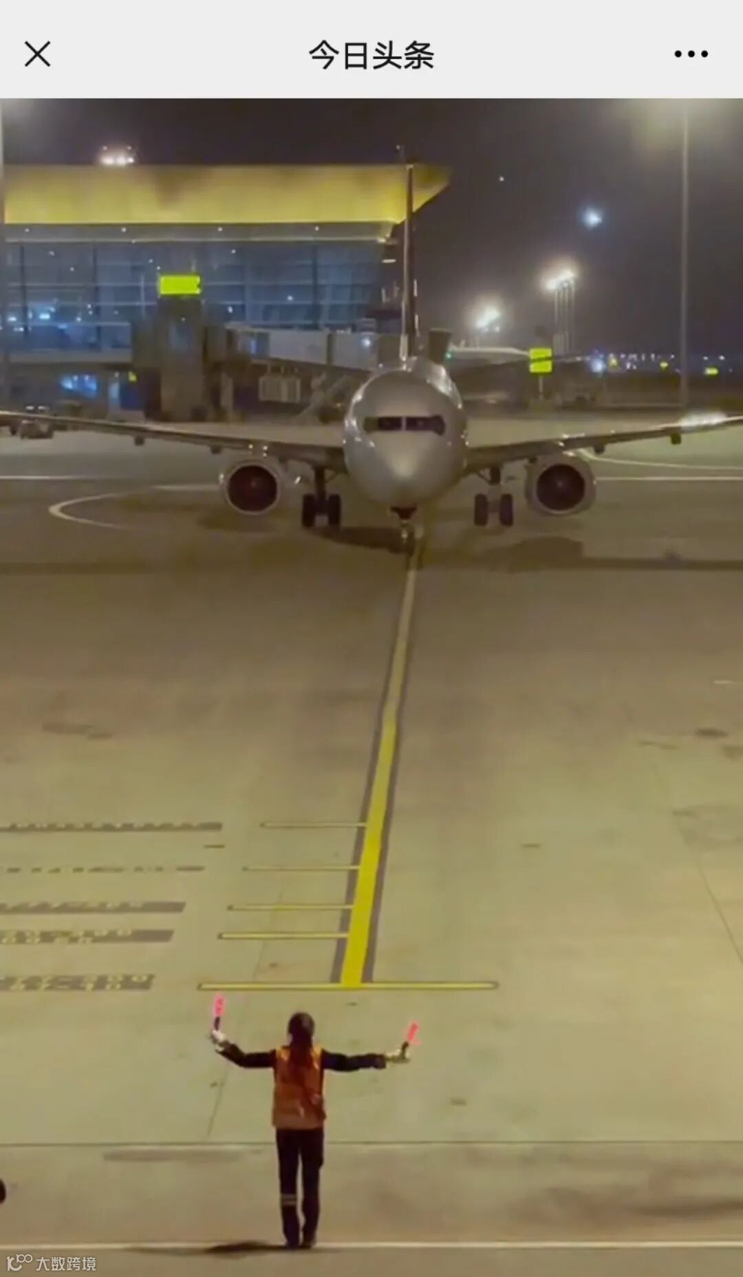 视频中,一名女性机务人员动作流畅地指导飞机转向、直行、减速、关停发动机(关停发动机即“抹脖子”,视频中她左手拿指挥棒由由右上方经脖子处斜向下划,表示提示机长需将发动机关闭,也叫发动机关车)。