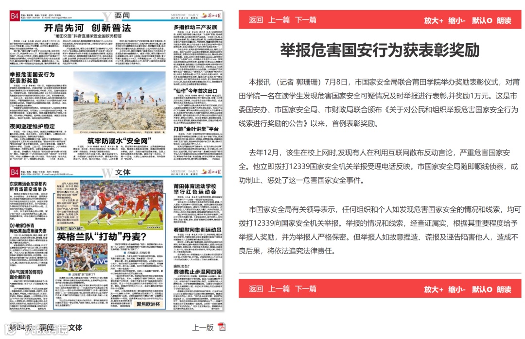 据湄洲日报报道,近日,福建省莆田市国家安全局联合莆田学院举办奖励表彰仪式,对莆田学院一名在读学生发现危害国家安全可疑情况及时举报进行表彰,并奖励1万元。
