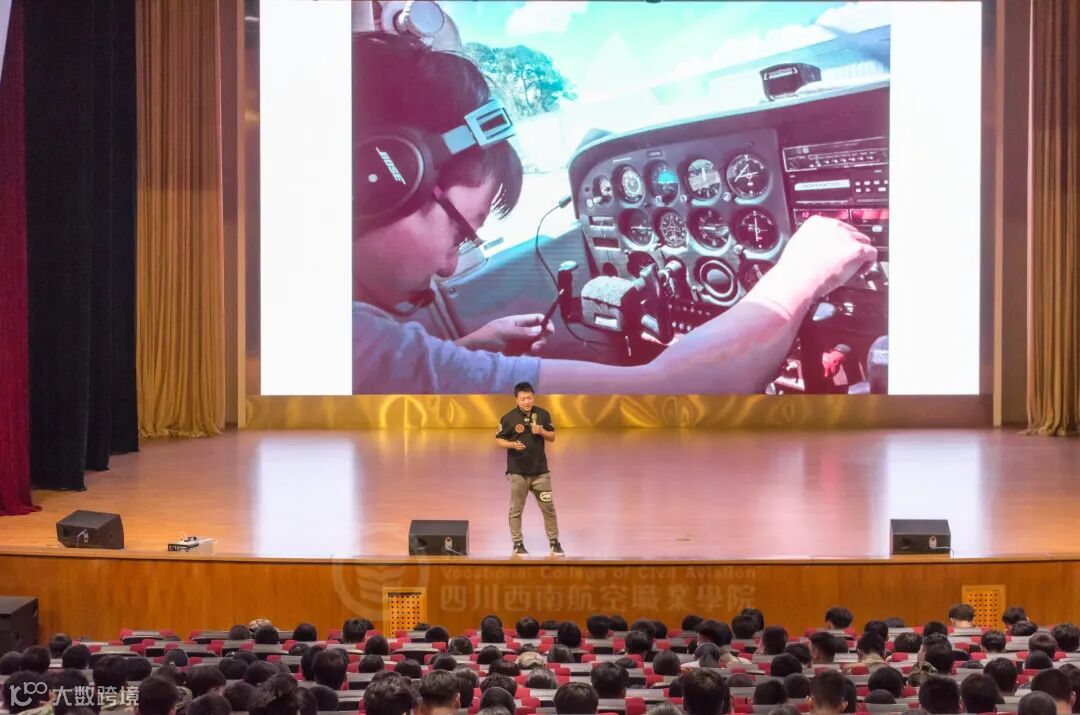 讲座开始,飞行梦想家王思莼首先讲述了他如何在30天顺利拿到飞行执照。同时,他也声情并茂地阐述了自己从飞行梦想萌芽、自我抉择到最终落地开花的一系列心路历程,并鼓励同学们有梦想就要勇敢去追。