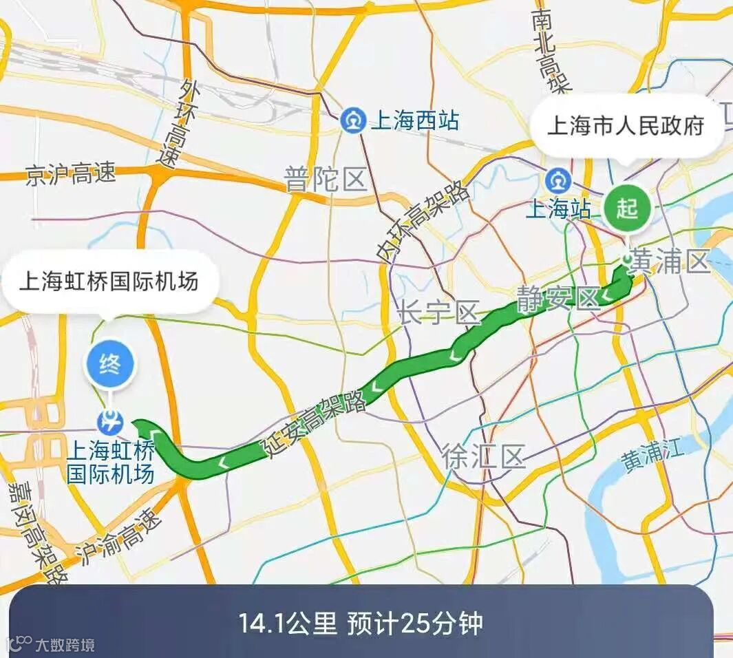 上海虹桥国际机场已经完全被市区包围了,距离黄埔区的人民广场只有14公里路程。