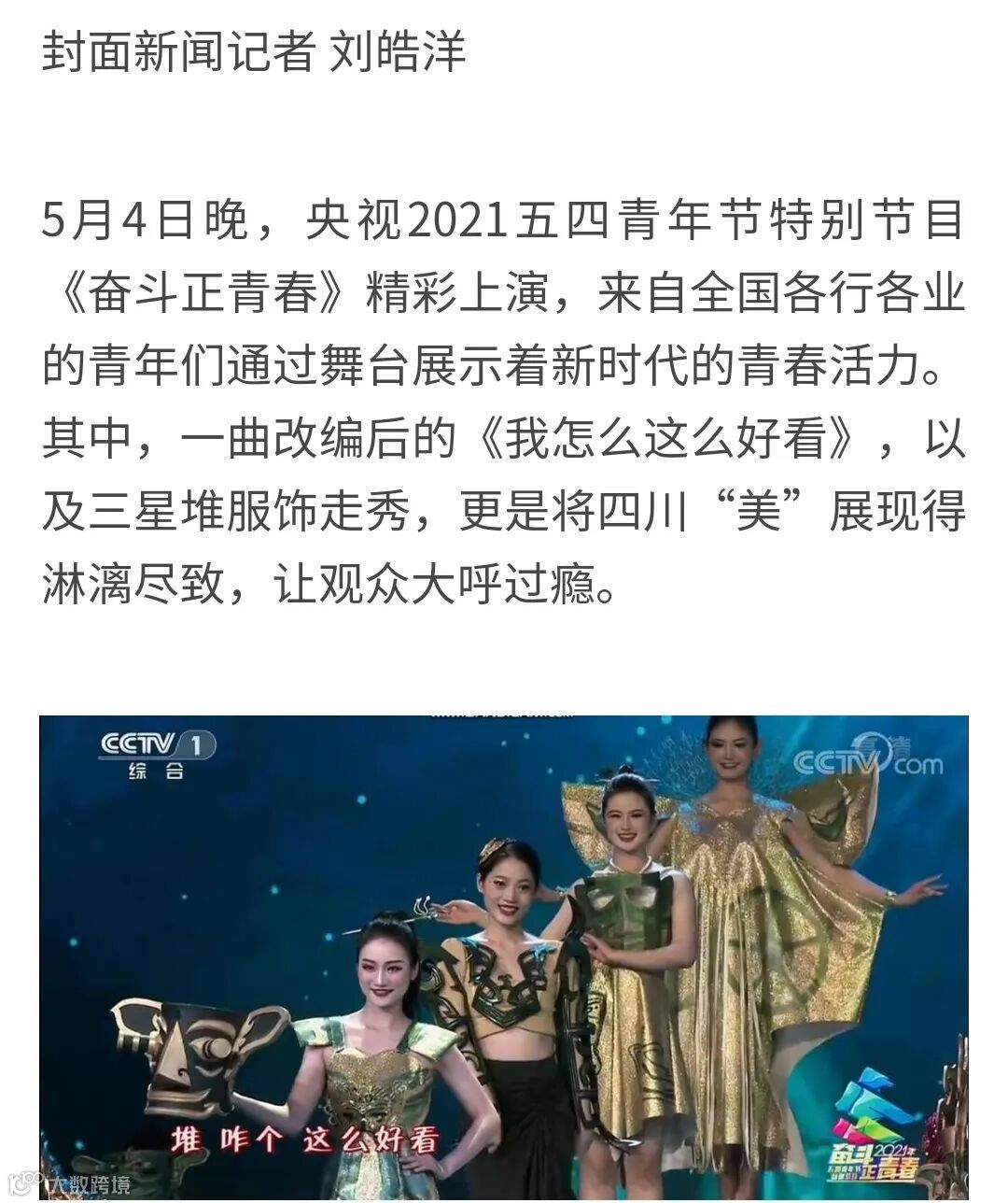 非常荣幸此次代表学校参加央视五四青年节特别节目,对我们而言,这是非常好的平台和锻炼机会。虽然穿着高跟鞋走了一遍又一遍,但当我站在央视舞台上聚光灯打在我脸上时,感觉一切都是值得的!此次赴京我们身着“三星堆”主题纯手工设计服装亮相央视大舞台,每一件衣服上面都带有面具、神鸟等精美的图案,用自己的方式来传承和弘扬三星堆文化,让更多人了解古蜀文化的神秘与伟大!通过这次的北京之行,丰富了我的实践经验,在以后的日子中我要更加努力学习,不断地去完善自己。
