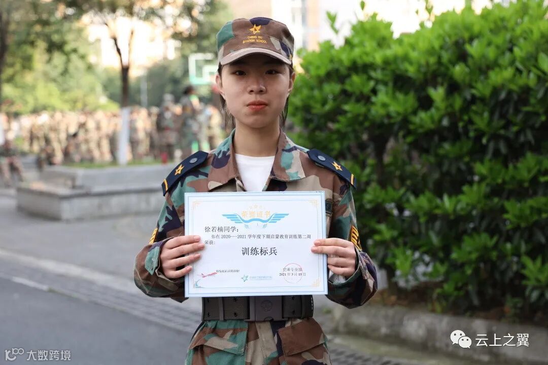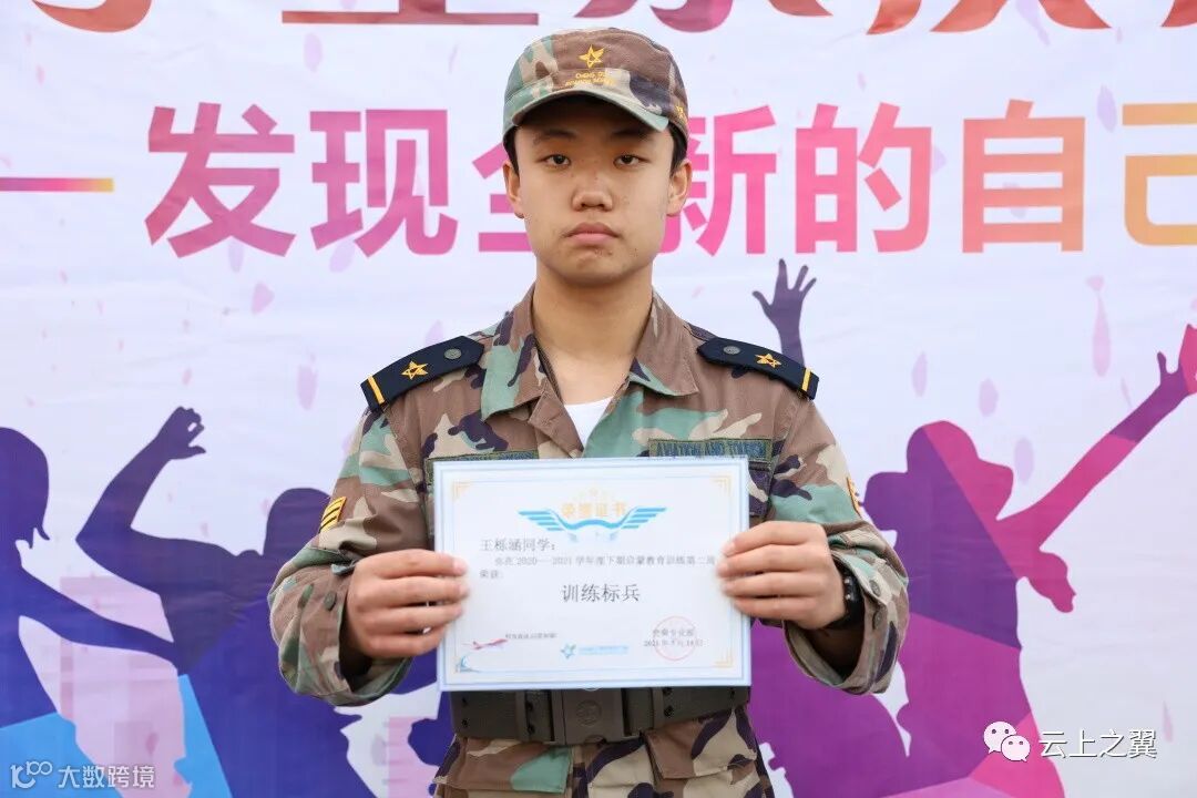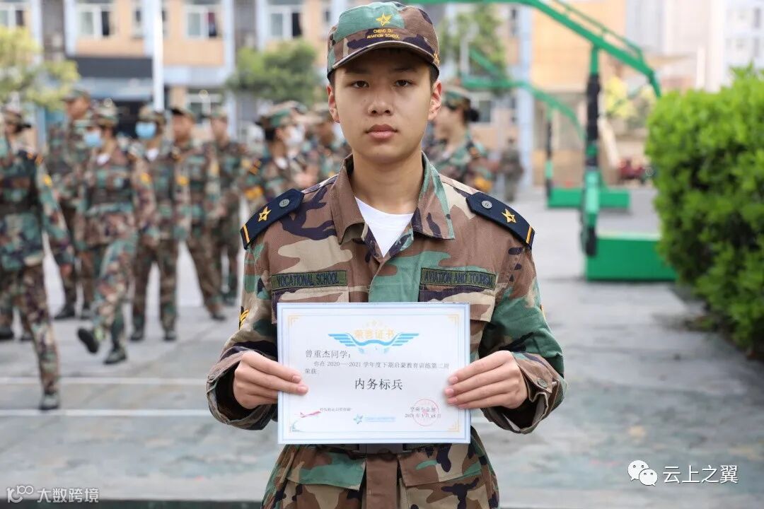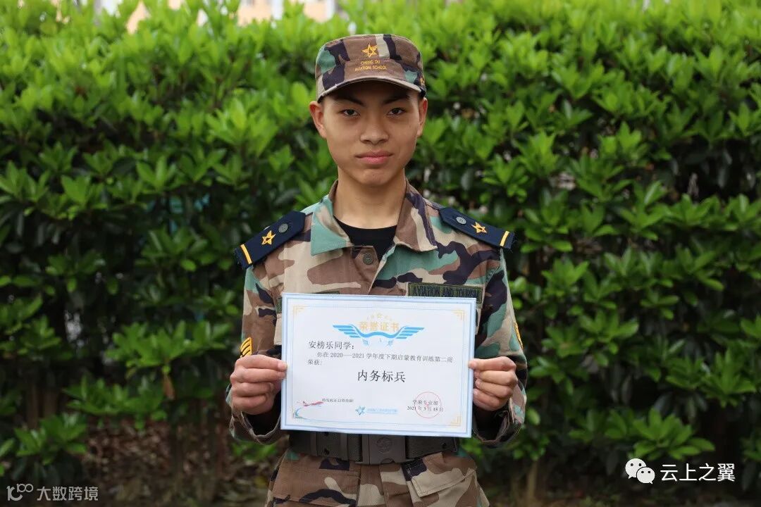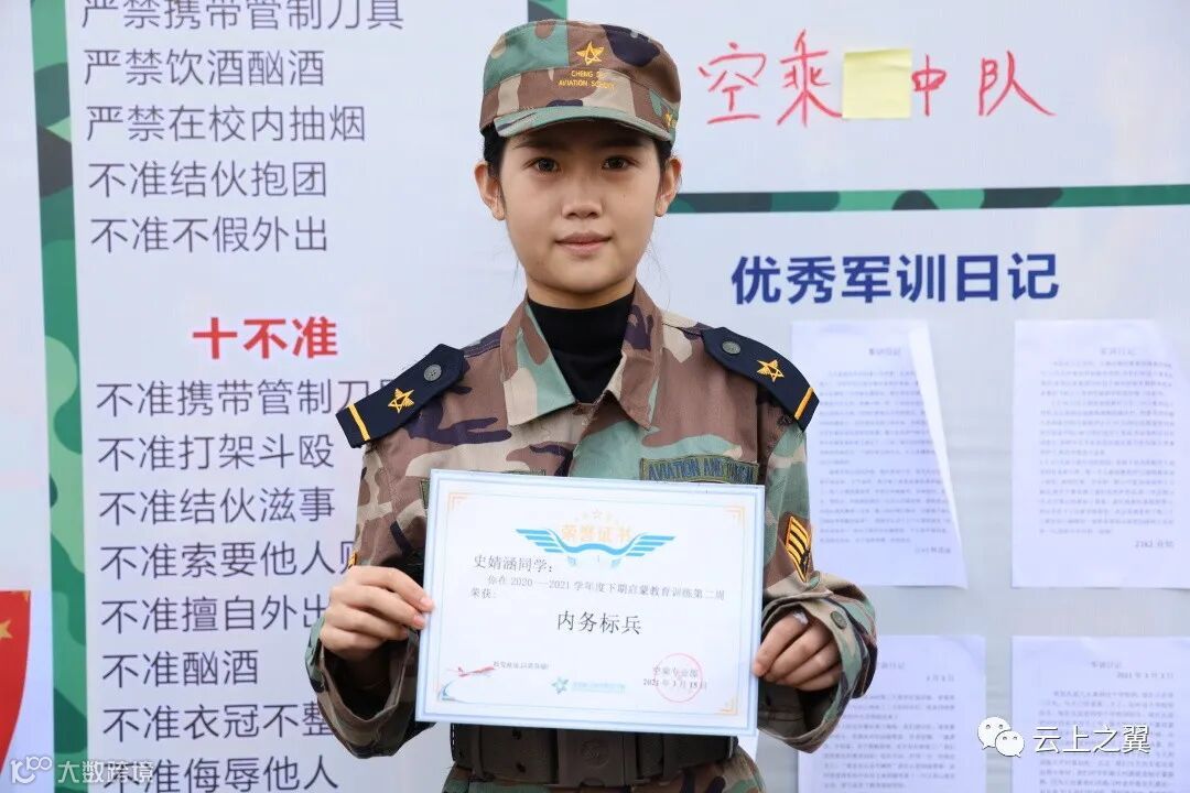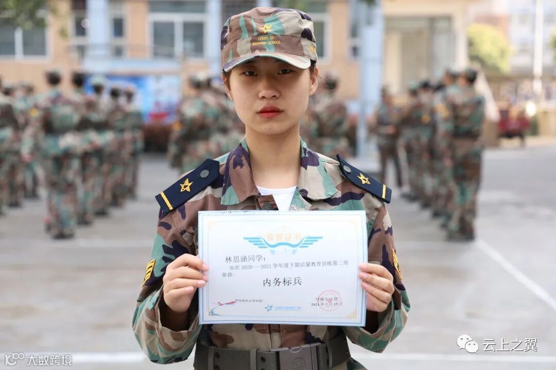 我是空乘空保一中队徐文定,来自广东-深圳,这周我拿到了训练标兵的称号,这是老师和教官对我这周军训成果的肯定,在今后的日子里我也会更加严格要求自己!