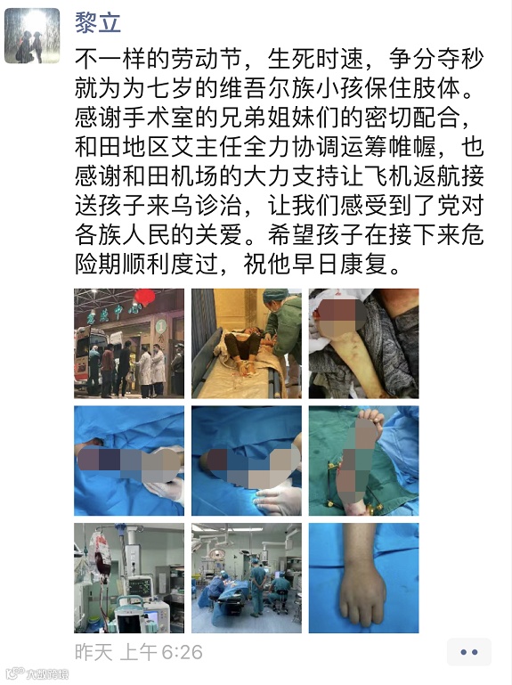 事情要从4月30日说起,一位7岁男孩因手臂被拖拉机绞断,需紧急前往乌鲁木齐进行接臂手术。当地医生告知,手术需要在6小时之内完成,否则细胞坏死后将无法治疗。