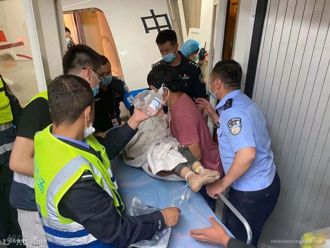 23时54分,乘务长再次打开舱门,小男孩和家属在医护人员的陪同下登机