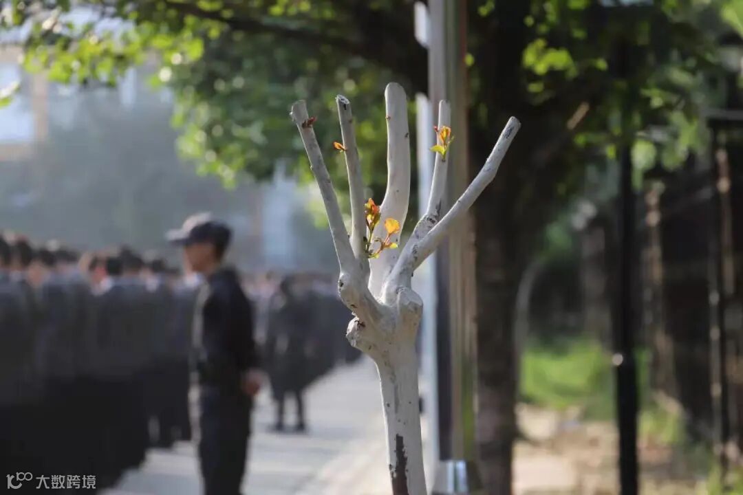 楼外的线条,从草木的曲折中,可以清晰看到一束束阳光透过枝叶,看到那一束束阳光最后为清扫道路的后勤人员,所折射的景色,如同定格一刻。帚落尘起浅影跃,将最后的枯荒收敛其中。
