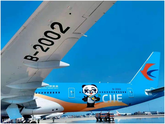 “进博号”选定了东航目前载客量最大、航程最远、搭载全球领先客舱服务系统的国际远程旗舰宽体机——波音777-300ER进行喷涂。整个彩绘以进博主色调为基色、吉祥物“进宝”活泼形象跃然其上的展现形式,实现了进博形象和飞机美学的完美融合。