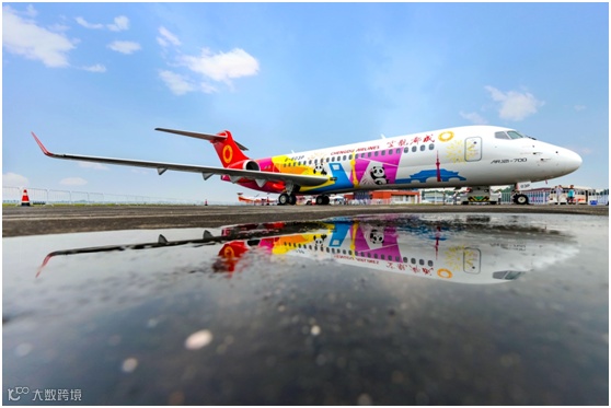 这架飞机是我国的国产飞机ARJ21,采用的是“中国梦”涂装,涂装设计运用简洁抽象的几何图形勾勒出成都锦绣天府塔、安顺廊桥、上海环球金融中心等的形象。