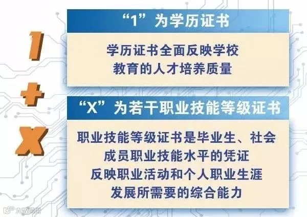 “1”为学历证书,“X”为若干职业技能等级证书。探索实施“1+X”证书制度,是《国家职业教育改革实施方案》的重要改革部署,也是重大创新,体现了职业教育作为一种类型教育的重要特征,是落实立德树人根本任务、完善职业教育和培训体系、深化产教融合校企合作的一项重要制度设计。