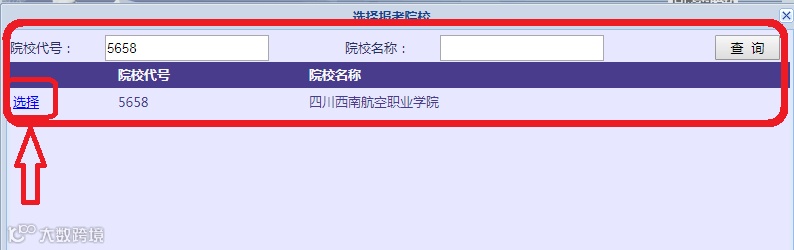 输入四川西南航空职业学院四川省招生代码:5658,院校名称:四川西南航空职业学院,点击查询,然后点击学校序列最前方“选择”。