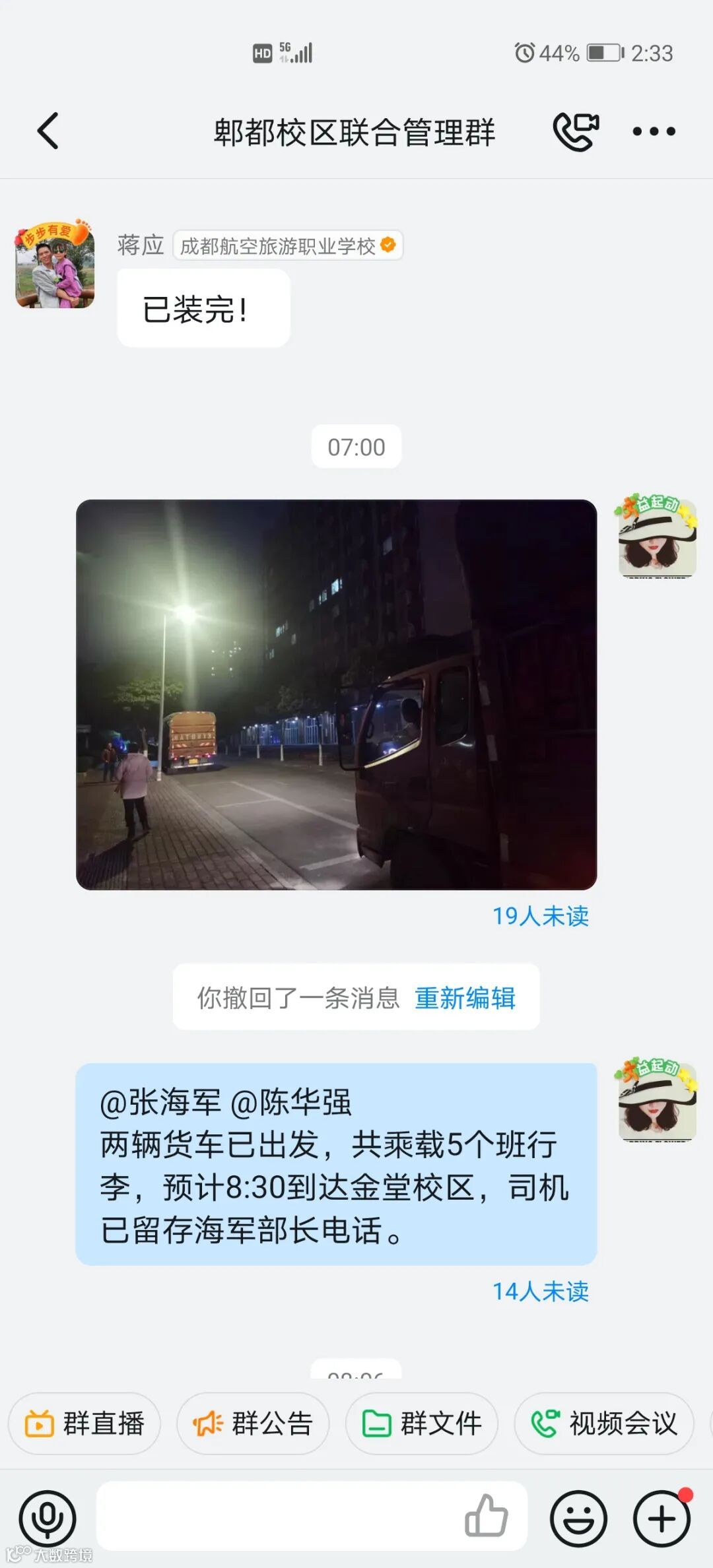 天未亮、人已到、车启动,一批又一批的食堂员工,他们任劳任怨,无论男女、无论老少,一趟又一趟地把学生的行李从郫都校区教室提上货车,又不辞辛劳地从货车上将行李搬至金堂校区教室,叔叔阿姨们哪怕脚走疼了手勒破了,心里却乐滋滋的,只为能让孩子们返校能第一时间领取行李,早日睡上自己温暖的小窝,为孩子们的返校入住保驾护航。