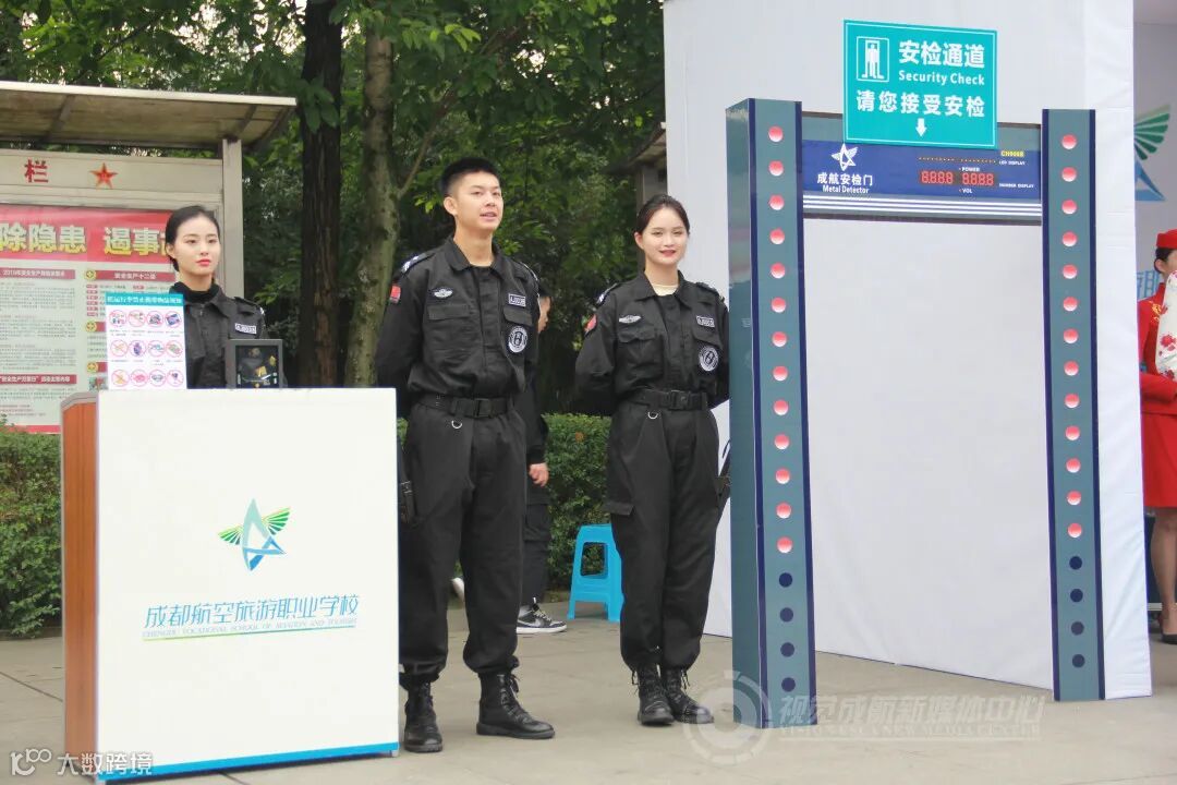 在现场由我们专业部的同学们带来了专业技能的展示,从进入“机场”开始,安检专业部的同学展示了如何进行正确的安检,过了“安检”,顺利“登机”后,我们空乘专业部的同学现场演示了如何正确穿戴救生衣和佩戴氧气面罩。