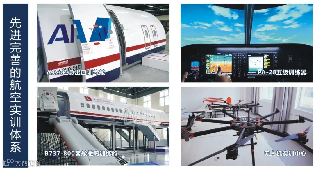 目前已拥有多种教学设施设备,拟购买波音737实体飞机,建立模拟飞行训练中心、飞机发动机拆装训练中心、空中乘务实训中心等多个航空专业实训体系,包含R44五级训练器、PA-28五级训练器、PA-44五级训练器、波音737模拟客舱、B737-800应急撤离训练舱等,设施先进,配置齐全,为学院航空人才培养提供了有力保障。