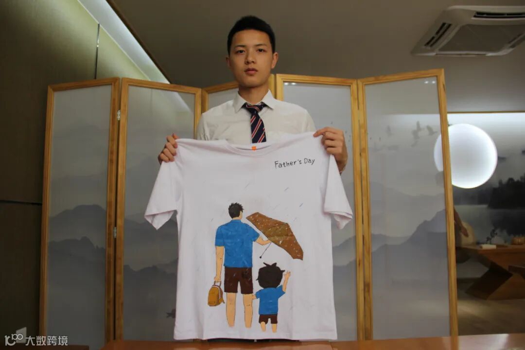 “还记得最初拿到作业题目后,还是有点蒙圈,不知道应该怎么做。听了老师讲了她和父亲之间的故事,让我深受感动,并顺利完成了这个作业。”许荣彬同学的作业是手绘亲子T恤一套。因此,他手绘了小时候父亲为他打伞的画面,这也是他记忆中最清晰的与父亲相处的情景。